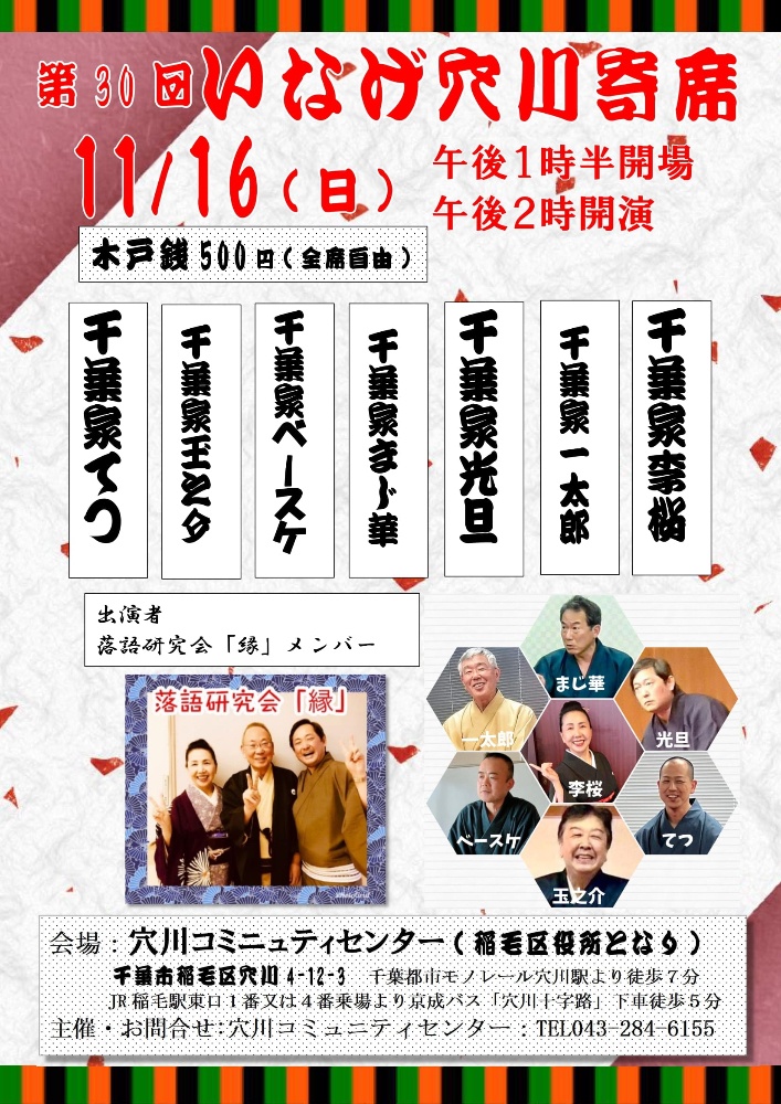 2025年11月16日(日) 14時〜 第31回いなげ穴川寄席 会場:穴川コミュニティセンター